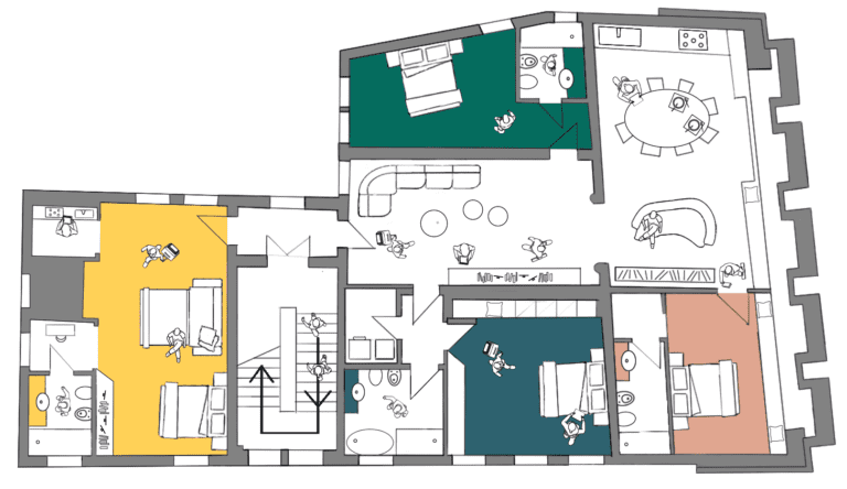 Ogni Suite si distingue per colori, materiali, tessuti e arredi selezionati con cura, riflettendo un’anima propria e un’atmosfera inconfondibile.